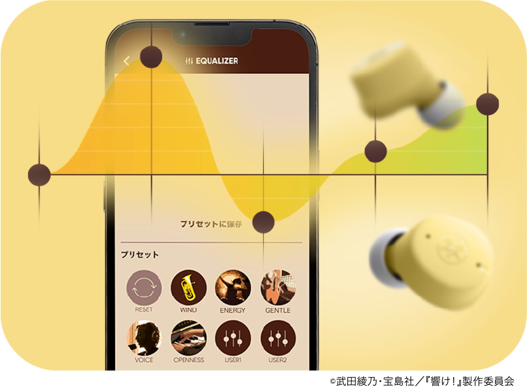専用アプリ「Headphone Control」に搭載したEQプリセットには、コラボイヤホンだけの「WIND」を搭載しました。劇中歌をより臨場感あふれる音でお楽しみ