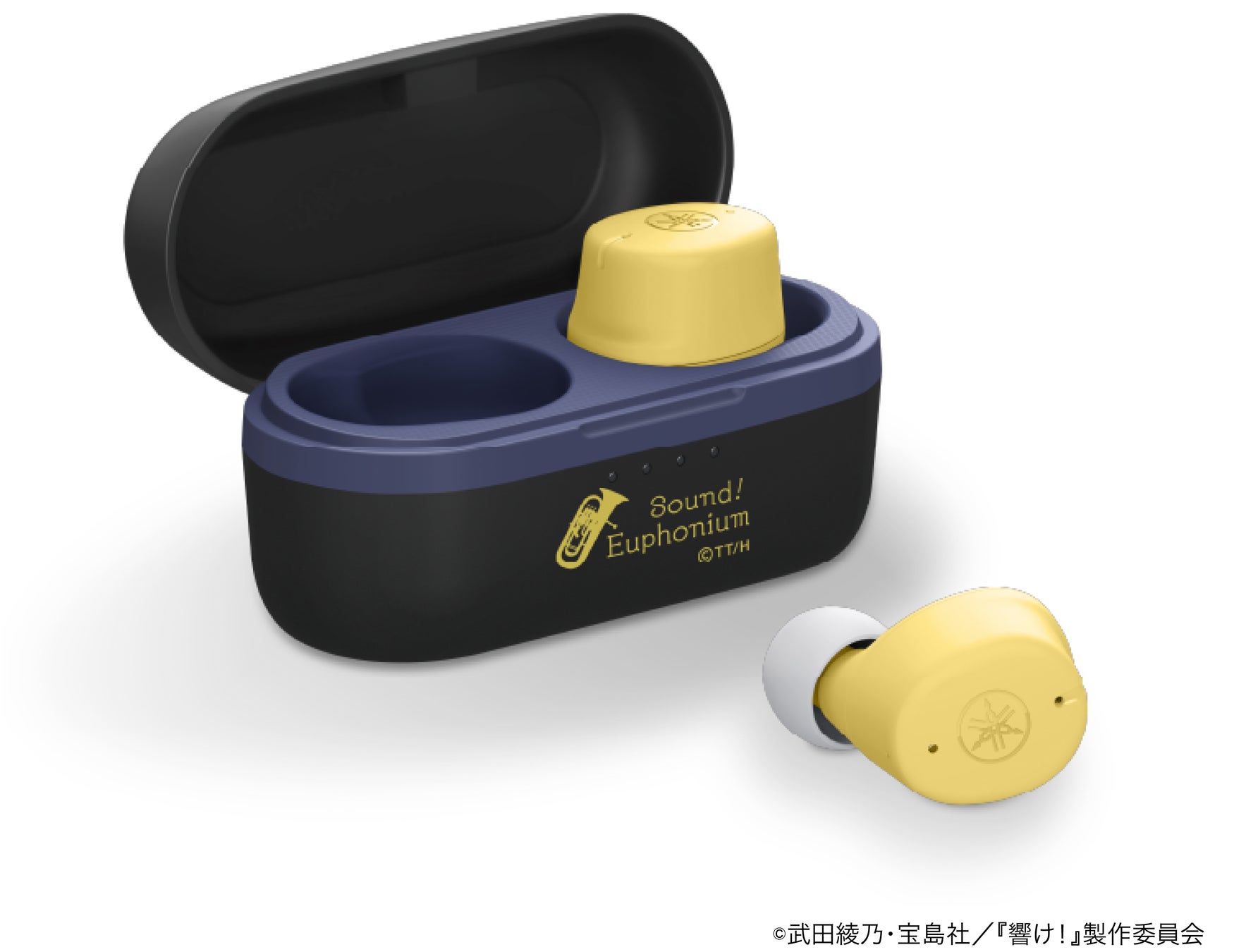 イヤホン本体には、主人公をイメージしたイエローカラーを採用しました。また充電ケースは前面にオリジナルのロゴをあしらったうえ、ユーフォニアムがケースに納められている様子をイメージさせるカラーに仕上げています。