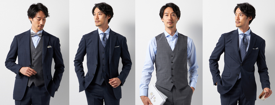 紺ジャケット、紺パンツ、グレーパンツに加え、リバーシブルベストの4アイテムがそろったスーツです。スーツスタイル、スリーピーススタイル、ジャケパンスタイル、パンツ+ベストスタイルなど、組み合わせ次第で6通りの着こなしが可能です。程よく光沢感があり、ビジネスからブライダルシーンまでご着用いただけます。