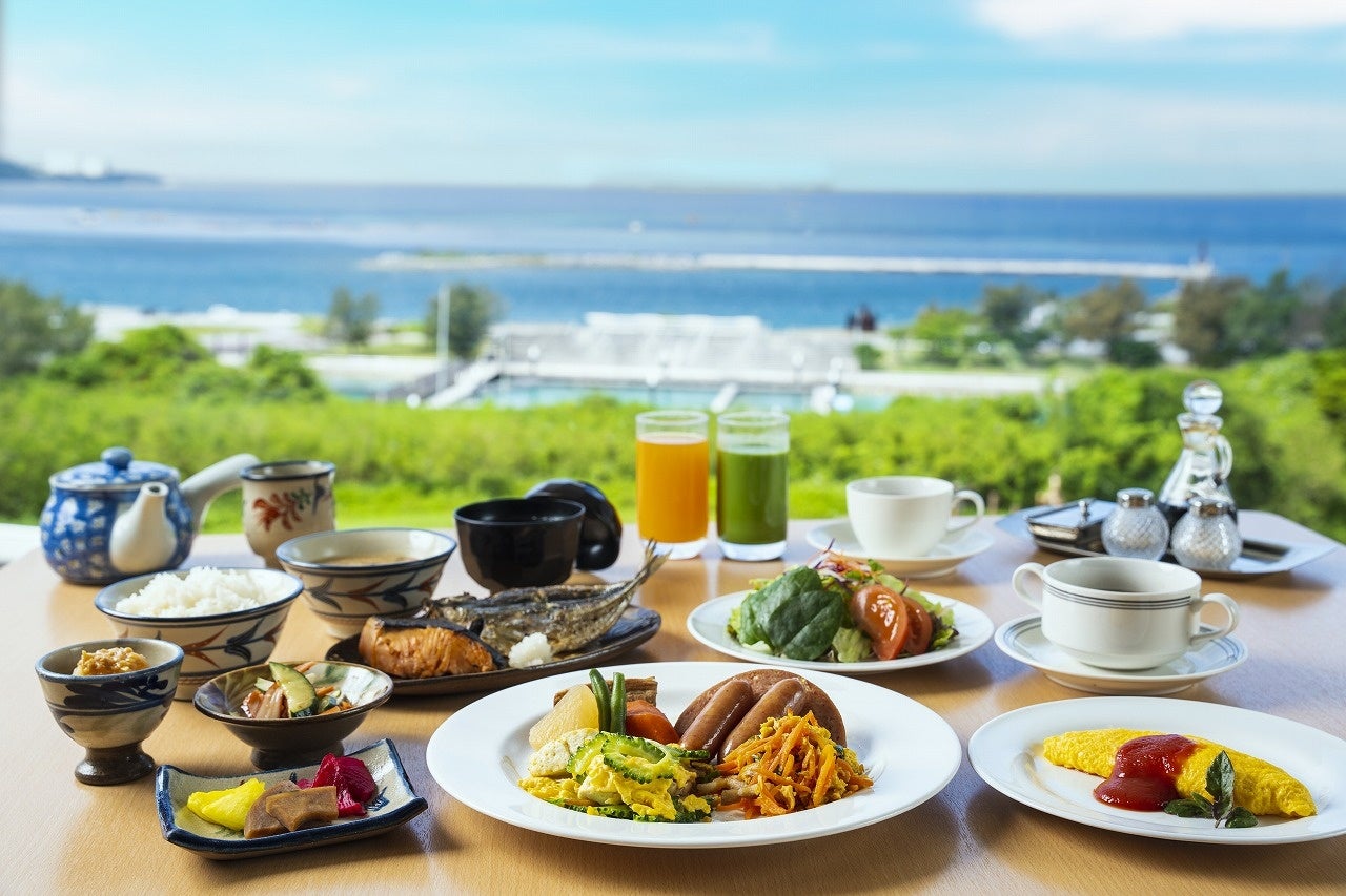 海絶景のレストラン「ブリーズ」にて、地元野菜などを味わえるヘルシー和朝食とセミバイキング