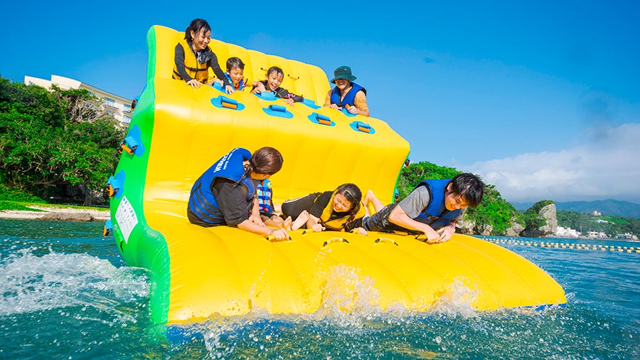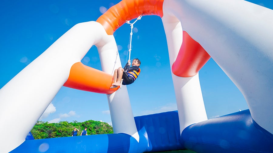 沖縄の海の上でいろいろな遊具と遊ぼう♪ すべり台にトランポリン、ターザンロープ、陸ではできないアクティブな動きもできちゃうかも。お子さまと一緒に楽しめる、おすすめのプログラムです。