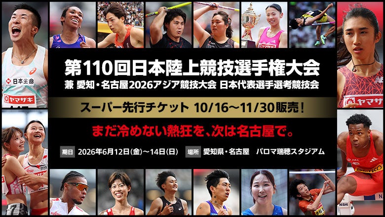 2026年6月12日(金)~14日(日)、名古屋市・パロマ瑞穂スタジアムにて開催される「第110回日本陸上競技選手権大会(https://www.jaaf.or.jp/jch/110/)」のスーパー先行チケットの販売が、2025年10月16日(木)10時よりスタートしました。