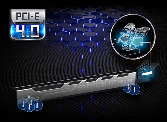 PCI Express 4.0スロットはスチールカバーで保護されており、物理的強度を高め安定性を確保しています。