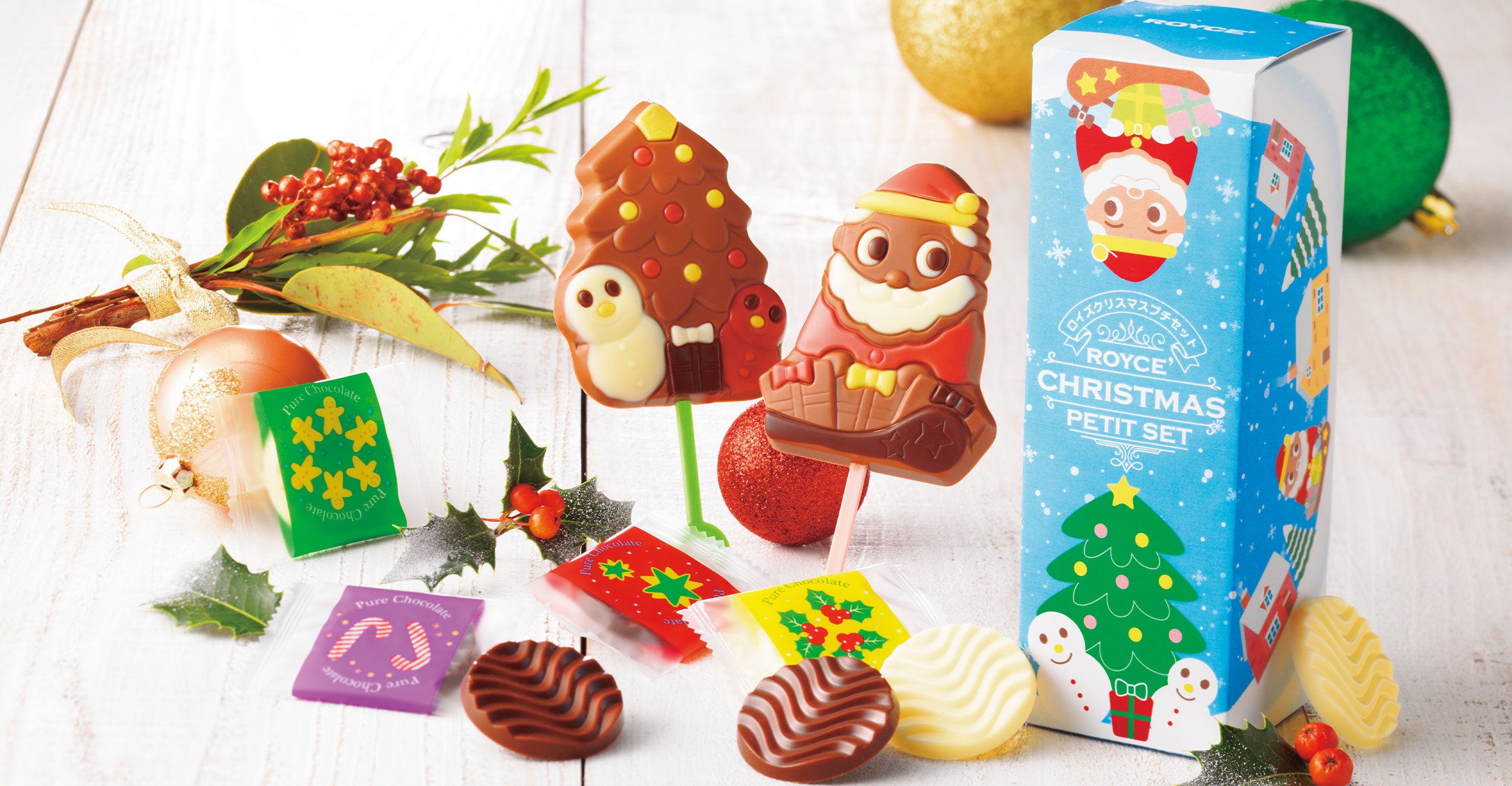 クリスマス限定の「ハッピーサンタ」&「クリスマスツリー」のロイズポップチョコと、クリスマスパッケージのピュアチョコレート2種類をセットに。クリスマスのちょっとしたプレゼントにもおすすめです。