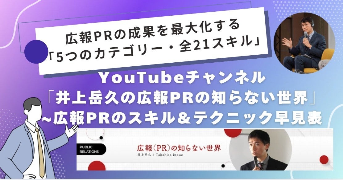 YouTubeチャンネル「井上岳久の広報PRの知らない世界」開設8ヶ月、膨大なノウハウを体系化した「5カテゴリーで21の広報PRスキル&テクニックの早見表」を公開!公開記念キャンペーン!