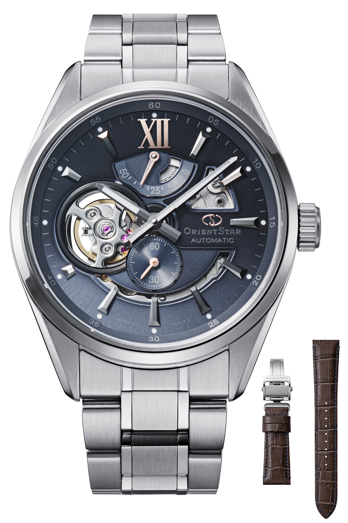数量限定で展開するMoving Blueの『モダンスケルトン』限定1,000本(国内300本・海外700本)、『セミスケルトン』限定900本(国内250本・海外650本)、『クラシックセミスケルトン』レディースモデル限定600本(国内150本・海外450本)の3種類は、すべて自社製の自動巻き(手巻き付)ムーブメントを搭載し、ステンレススチールのケースケースバックにLIMITED EDITIONの文字と限定シリアルナンバーが刻まれています。また、プレステージショップ専用モデルも準備しており、『モダンスケルトン』150本、『セミスケルトン』150本、『クラシックセミスケルトン』レディースモデル100本は、それぞれ文字板とマッチしたグレーの皮革バンドがセットで付属し、好みに合わせて付け替えが楽しめます。