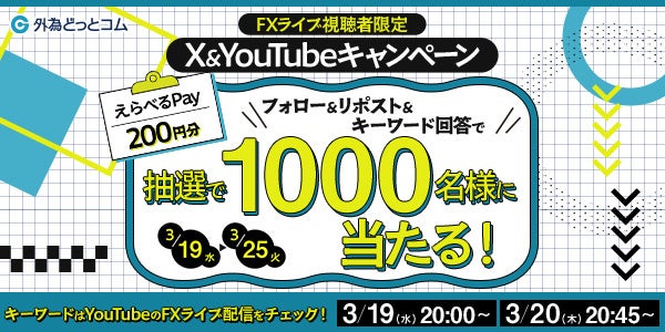 株式会社外為どっとコム(本社:東京都港区、代表取締役社長:竹内 淳)は、当社公式Xにおいて2025年3月19日(水)より「【FXライブ視聴者限定】X&YouTubeキャンペーン」を実施します。
