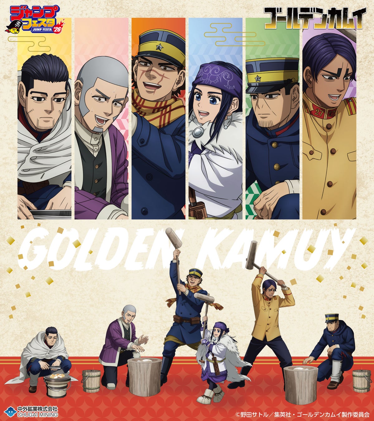 TVアニメ『ゴールデンカムイ』より、“餅つき”がテーマの新規描き下ろしイラストを使用したグッズが「ジャンプフェスタ2026」で登場!中外鉱業ブースにて先行販売決定!