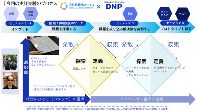 DNPと東大生研ONGは、企業の認知拡大や未来の顧客創出につながる職業体験、社会や仕事に関する情報収集といった体験学習だけでなく、事業推進や社会課題解決のために企業が求める人材を育成する学習プログラムを企業と学校の双方の目線でつくることの重要性に着目しました。そこで今回、DNPでは、DNPグループが教育事業等で培ったノウハウを基盤に、東大生研ONGが持つSTEAM型教育の視点で体系立て、改善を重ね、「STEAM型次世代育成プログラム」の基本モデルを開発しました。