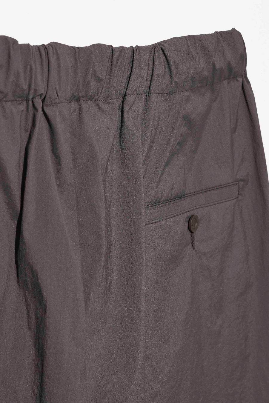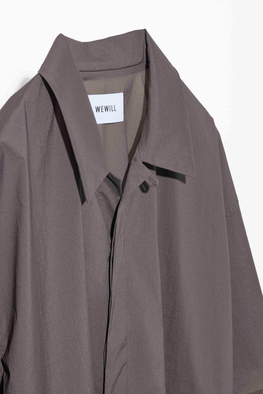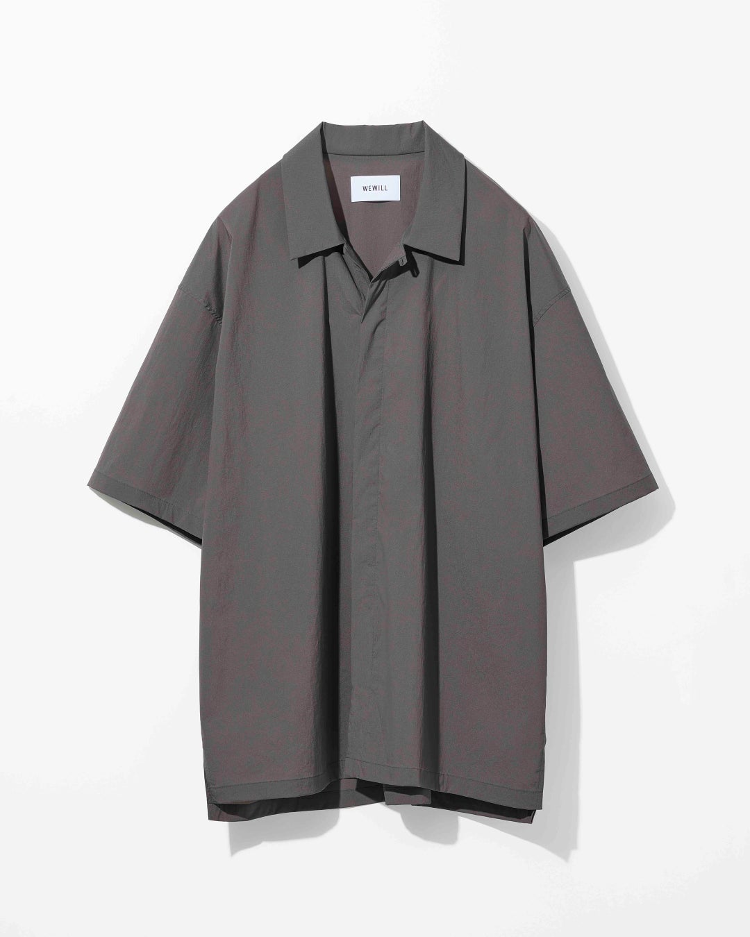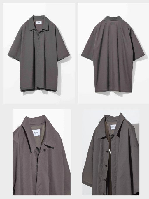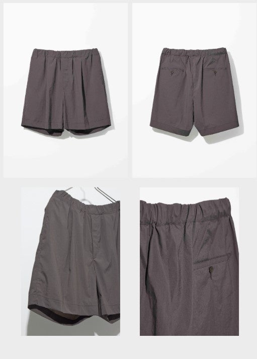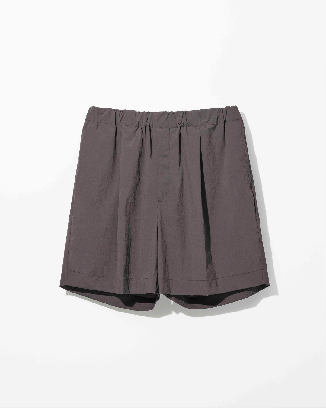 ナイロンストレッチ素材を使用した比翼仕立てのシャツと、ショーツのセットアップ。非常に軽やかで、マットな表面感とさらりとしたドライなタッチが特徴。ショーツはウエストにドローコードを通したイージー仕様で、ワンタックの入ったワイドシルエット。