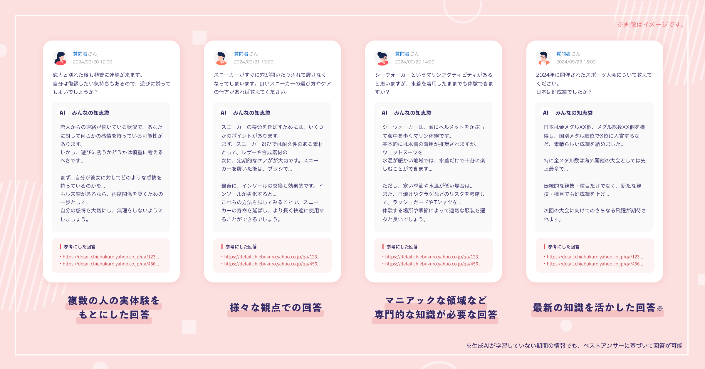 ※1:プレスリリース「Yahoo!知恵袋、生成AIによる回答を表示する『AI回答機能』を試験提供」https://www.lycorp.co.jp/ja/news/release/000974/