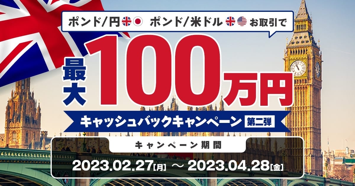 2023年2月27日(月)~2023年4月28日(金)の期間中、FX口座におけるポンド/円またはポンド/米ドル、それぞれの通貨ペアの新規取引の合計数量に応じて最大100万円(各通貨ペアごと)をキャッシュバックいたします。
