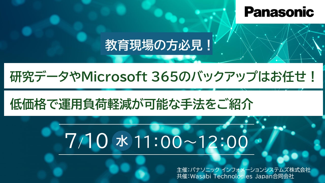 パナソニック インフォメーションシステムズ株式会社は、2024年7月10日(水)教育現場の方必見!研究データやMicrosoft 365のバックアップはお任せ!低価格で運用負荷軽減が可能な手法をご紹介 セミナーを開催します。