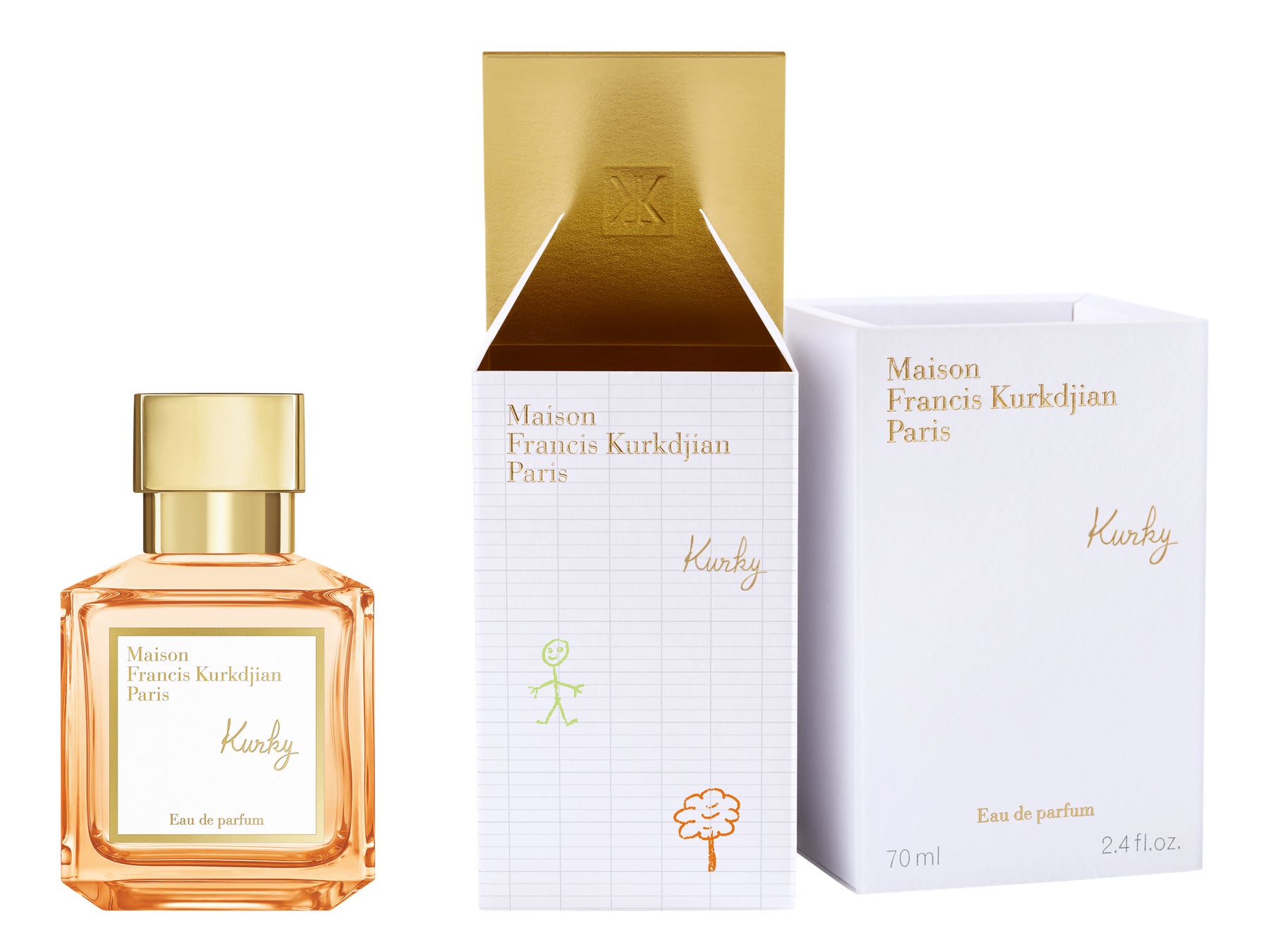 パッケージのデザインは、フランシス・クルジャンの子ども時代から着想を得ています。外箱は、内なる子供心をイメージした手描きのイラストを加えポップな仕上がりに。アイコニックなボトルは、透明なガラスをピーチカラーのラッカーで仕上げ、ラベルには子どもの手描き文字で「Kurky---クルキー(フランシス・クルジャン幼少期のニックネーム)」のロゴを入れています。