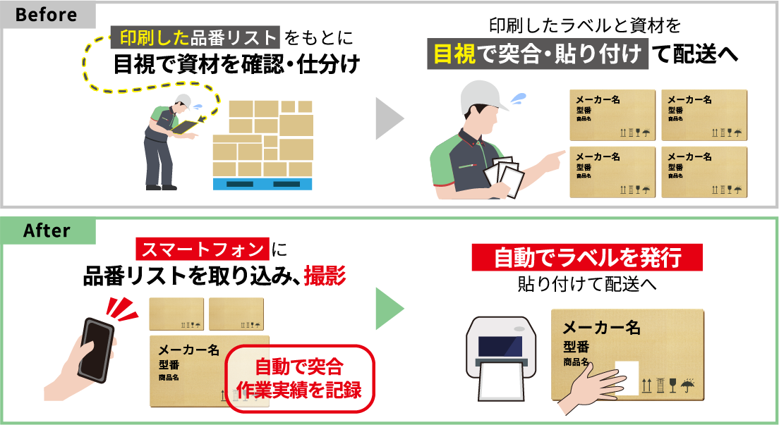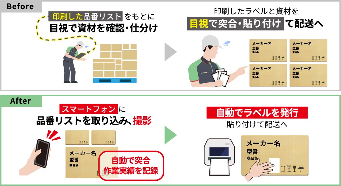 Future EdgeAI導入後は、配送先別の品番リストをスマートフォンに取り込み、作業員は表示された指示をもとに対象資材を撮影すると、自動で資材の品番と個数が突合できるようになります。突合結果は作業記録として保存されると同時に、出荷用ラベルがプリンタから出力されるため作業員は照合作業をすることなく、出荷資材にラベルを貼り付けできます。