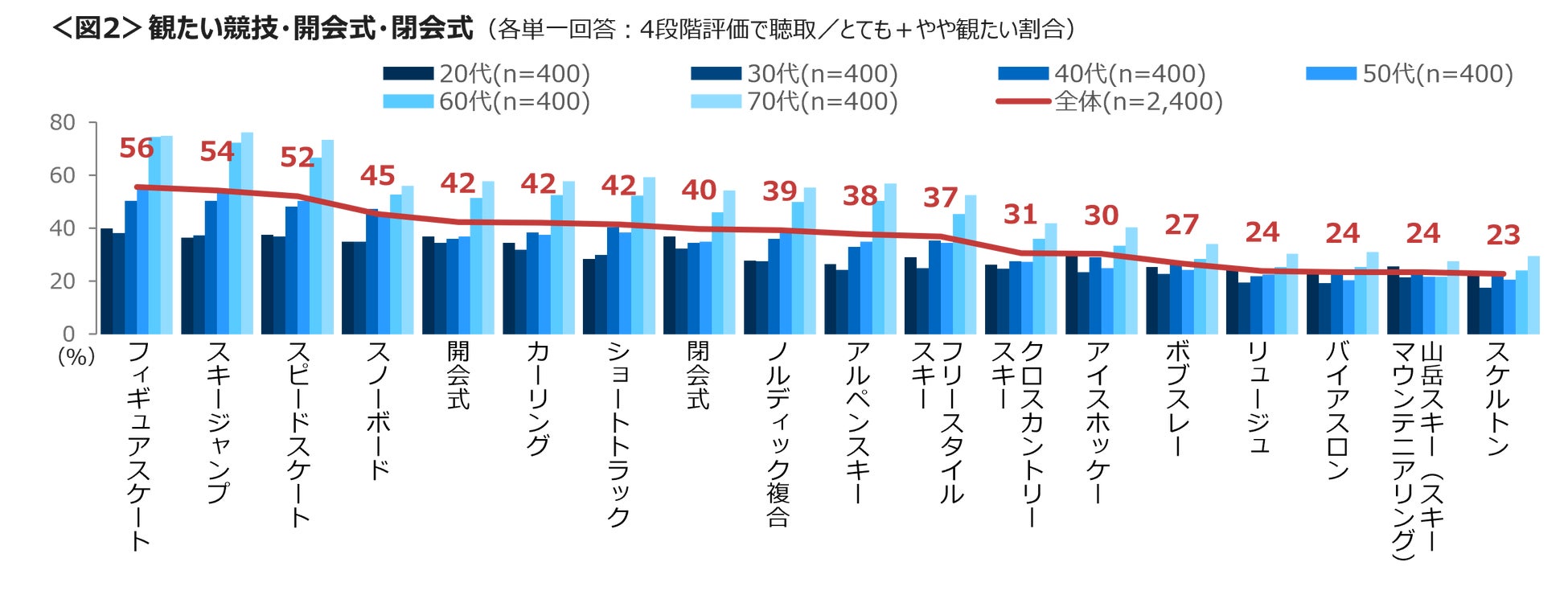 16の競技と開会式・閉会式を呈示し、4段階で観たいものを聴取した。とても+やや観たいは、「フィギュアスケート」56%、「スキージャンプ」54%、「スピードスケート」52%がTOP3で、いずれも日本のメダル獲得に期待が持てる競技あがった。次いで「スノーボード」「開会式」「カーリング」「ショートトラック」など。特に60~70代は多くの競技で観たい割合が高い。<図2>