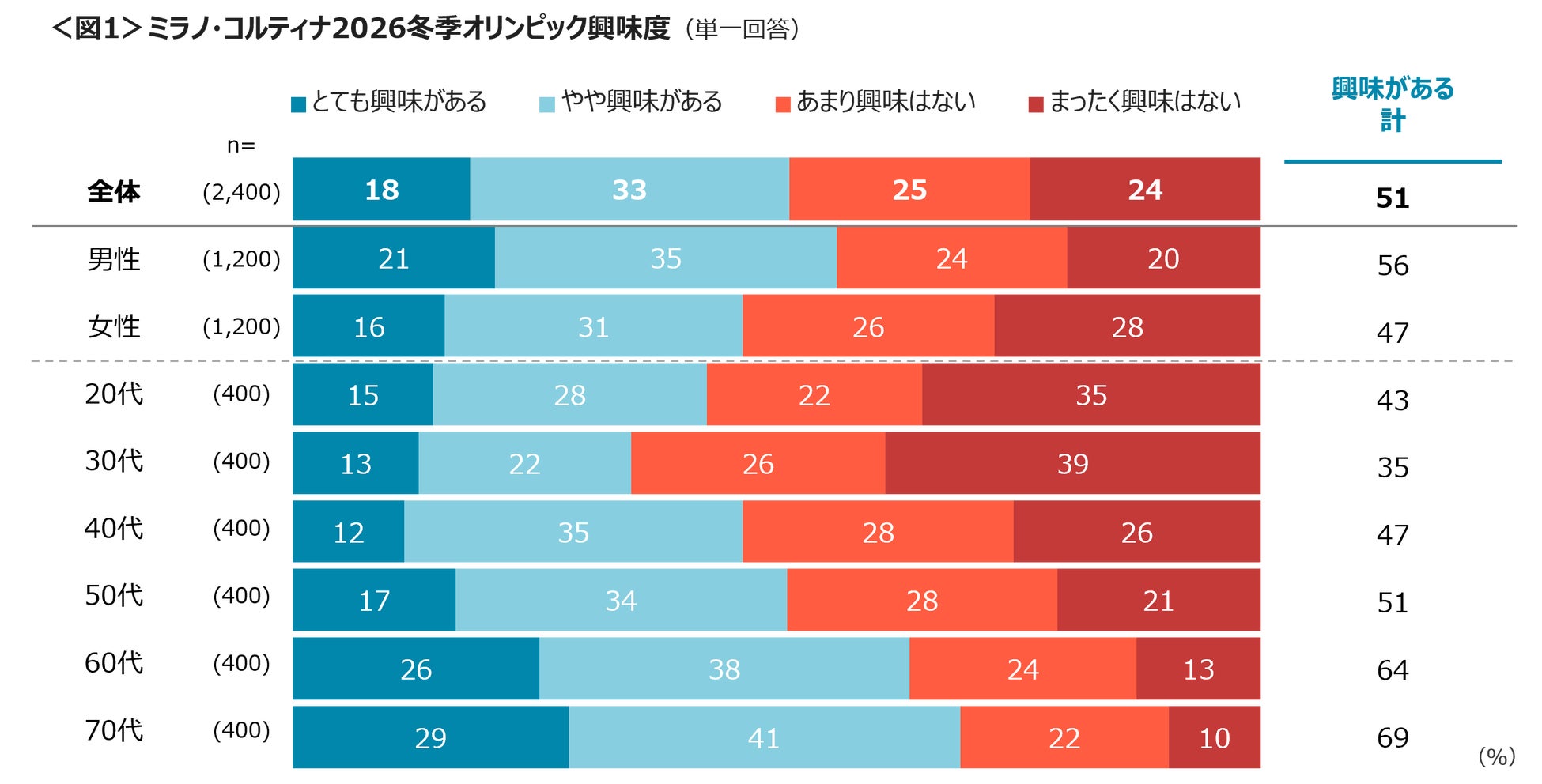 ミラノ・コルティナ2026冬季オリンピックの興味度は、「とても興味がある」18%、「やや興味がある」33%、合わせて51%。男性と60~70代の興味度は高く、最も低いのは30代。<図1>