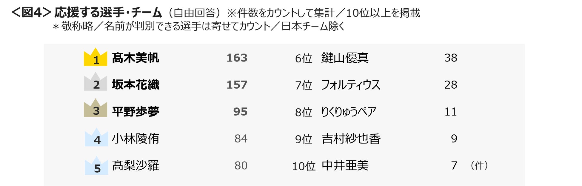 自由回答で応援する選手・チームを聴取した結果、スピードスケートの「髙木美帆」、フィギュアスケートの「坂本花織」、スノーボードの「平野歩夢」、スキージャンプの「小林陵侑」「髙梨沙羅」と複数回のオリンピック出場経験をもつ選手が上位についた。<図4>