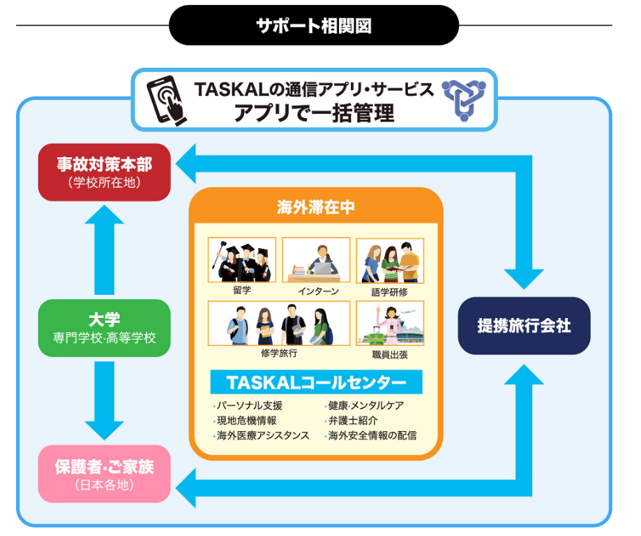 このように、ウィズコロナ時代における留学では、留学生本人だけでなく、その家族や学校まで連携し、平時における安心安全な生活面から、感染症や戦乱などの想定を大きく超える緊急事態まで、連絡から実際の支援まで即応できる危機管理体制の構築が重要です。TASKAL社では旅行会社系企業ならではの海外ネットワークと機能を活用し、留学先において想定される大小関わらない様々なトラブルに、スマホひとつでワンストップ対応する危機管理サービスを提供しております。
