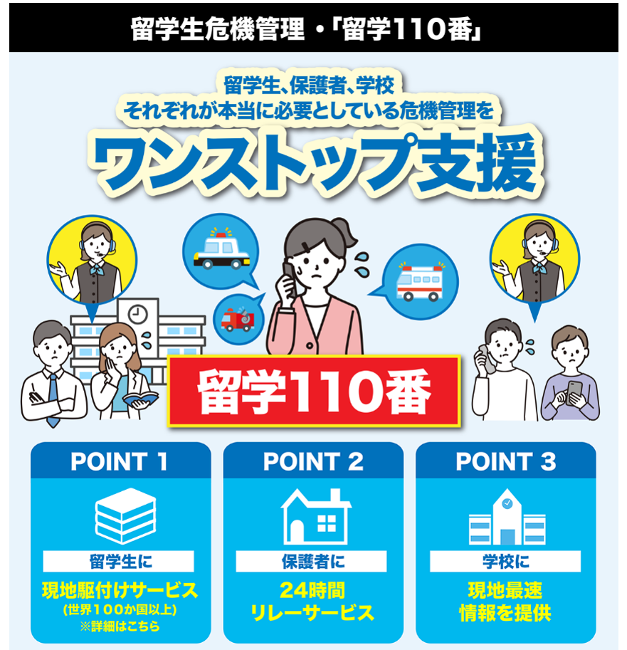 「留学110番」は、実際に渡航する留学生ご本人だけでなく、日本に残るご家族そして学校、それぞれが抱える留学に関する課題をスマホひとつでワンストップ支援する危機管理サービスです。有事の際の安否確認や、世界各国の安全情報をスピーディーに入手することが出来る自社開発アプリを介し、24時間365日コールセンターに無料で繋がります。さらに、全世界で連携する海外の現地パートナーを駆使して、留学生活で起こり得る様々なトラブルに対し、留学先現場での対応をサポートしていきます。