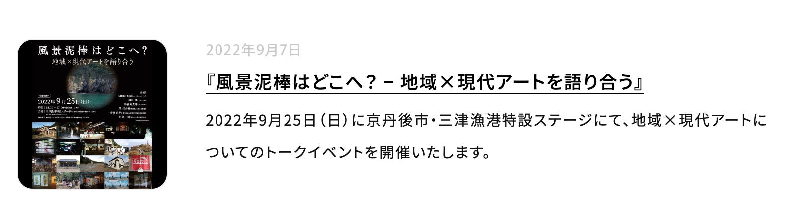 サイト内で紹介したヒトや場所について、さらに深掘りした記事や地域で起きている「コト」、次世代に向けた取組など、京都府の文化芸術の「輪」(=KYOTOHOOP)が深まる情報を掲載しています。