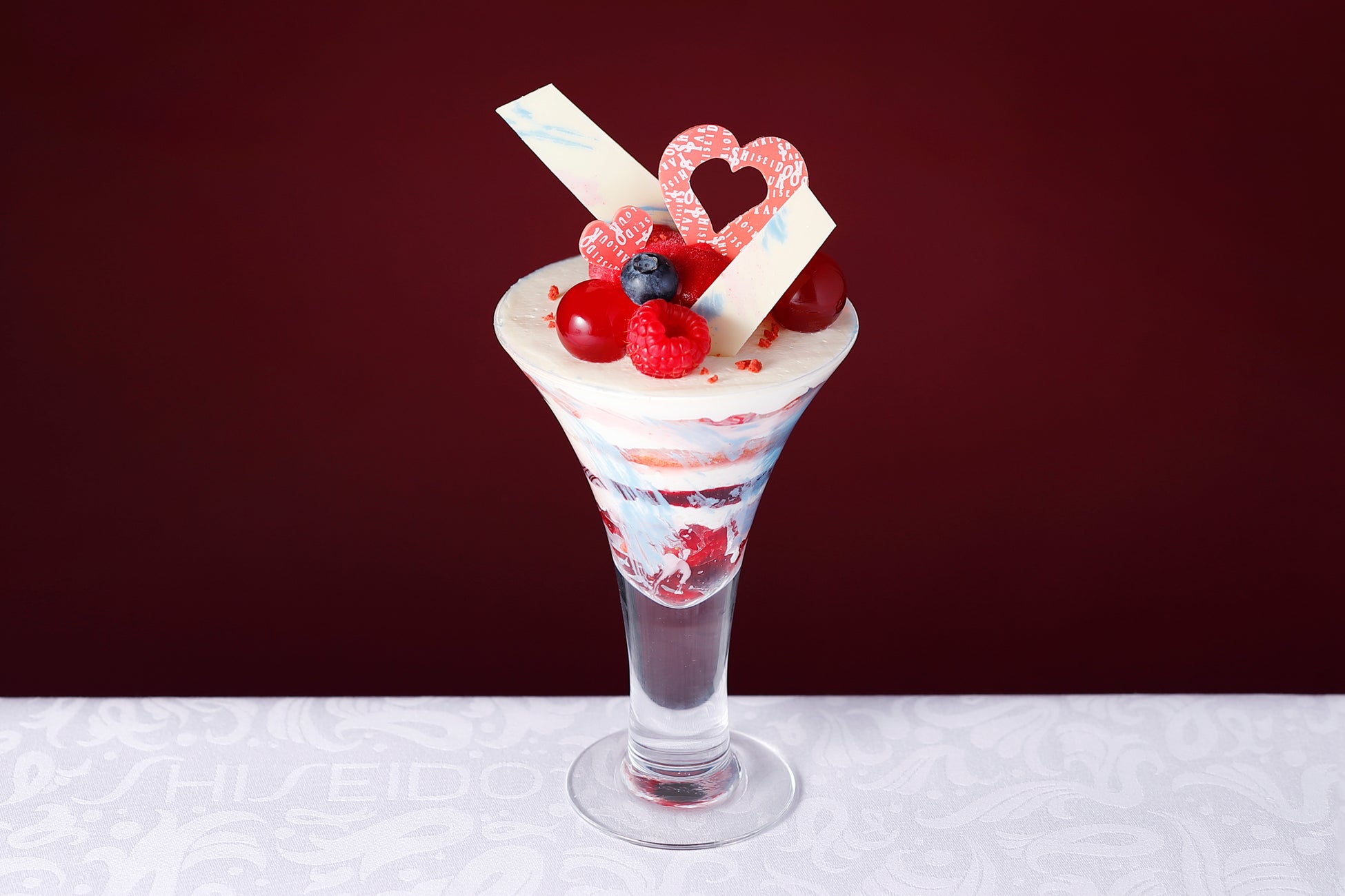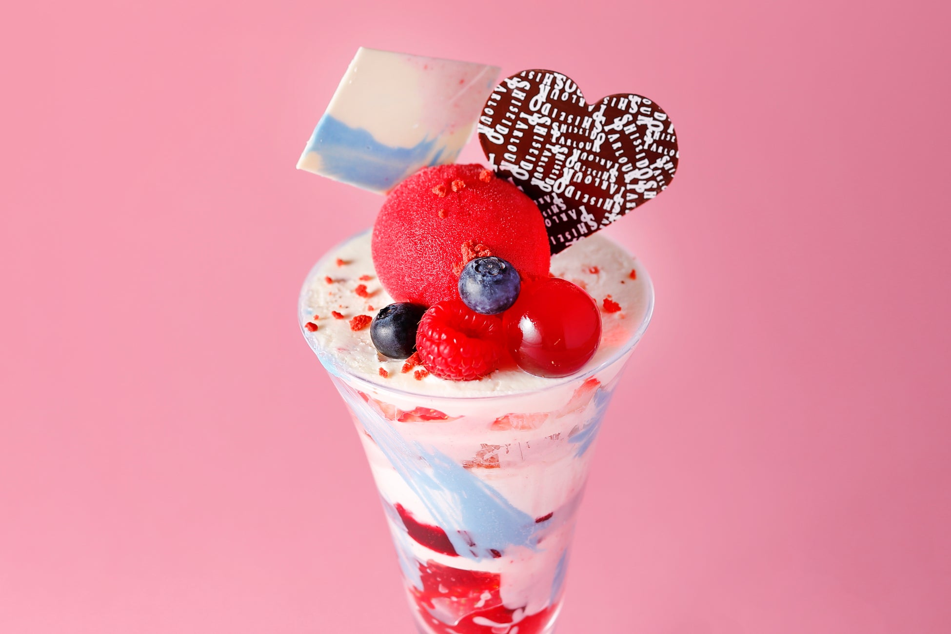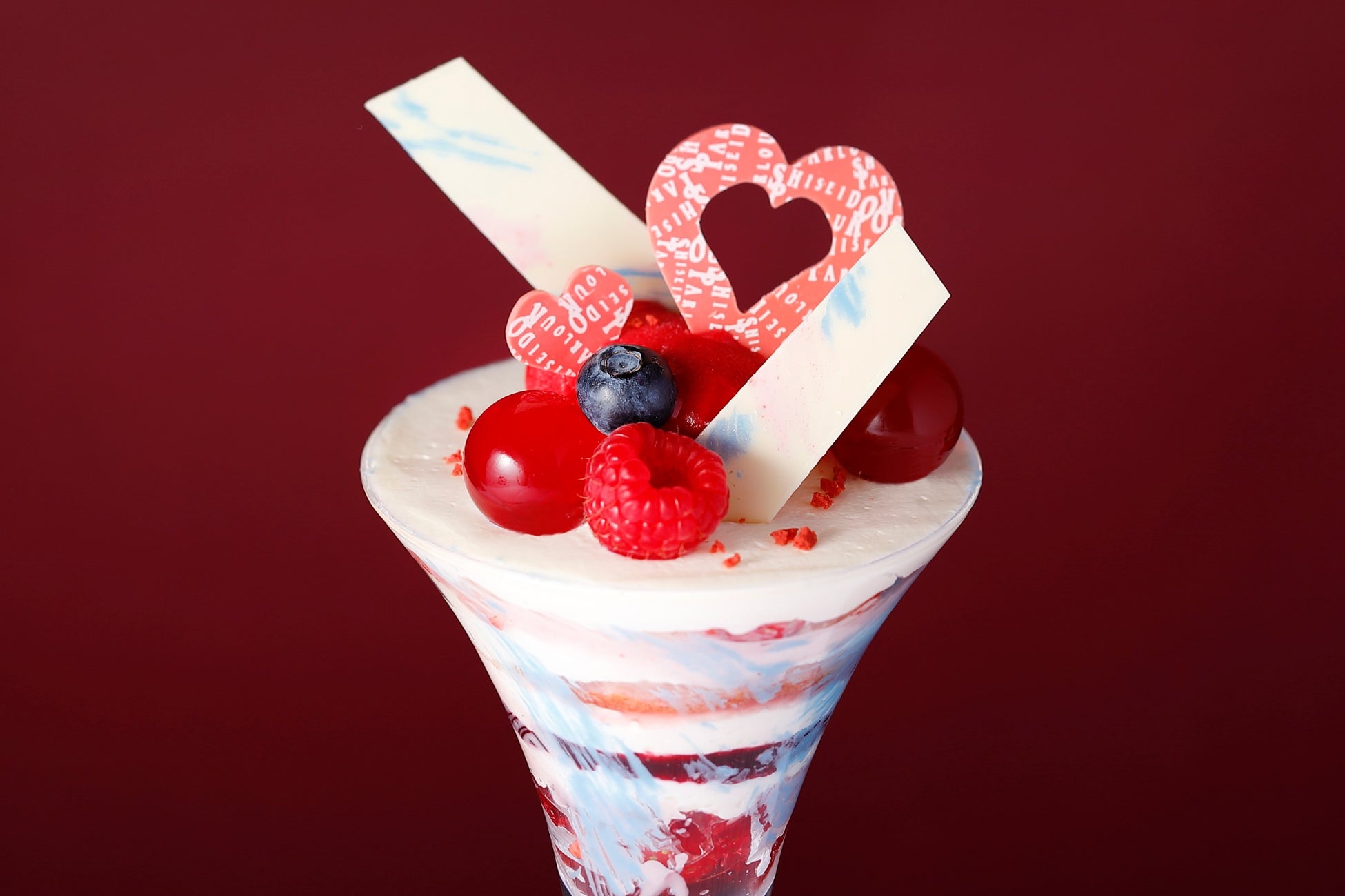 「資生堂パーラー 銀座本店サロン・ド・カフェ」と資生堂パーラー各店舗で、異なるデコレーションのバレンタインパフェを展開します。水色やピンクなど、パステルカラーのチョコレートで可愛く彩りました。グラスの中は、さまざまなベリーのティラミスが楽しめます。マスカルポーネの濃厚さとベリーの甘酸っぱさのハーモニーをご堪能ください。