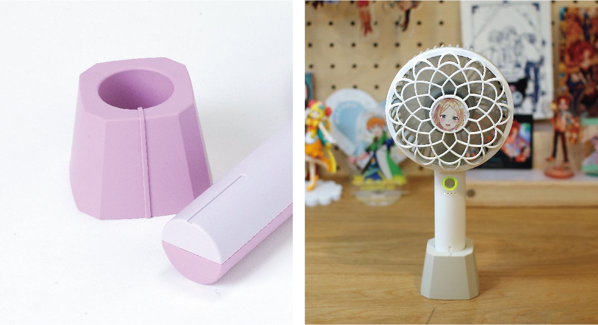 専用スタンドにセットすれば卓上でも使えるので、オフィスや自宅でも推しを見ながら涼めます。
