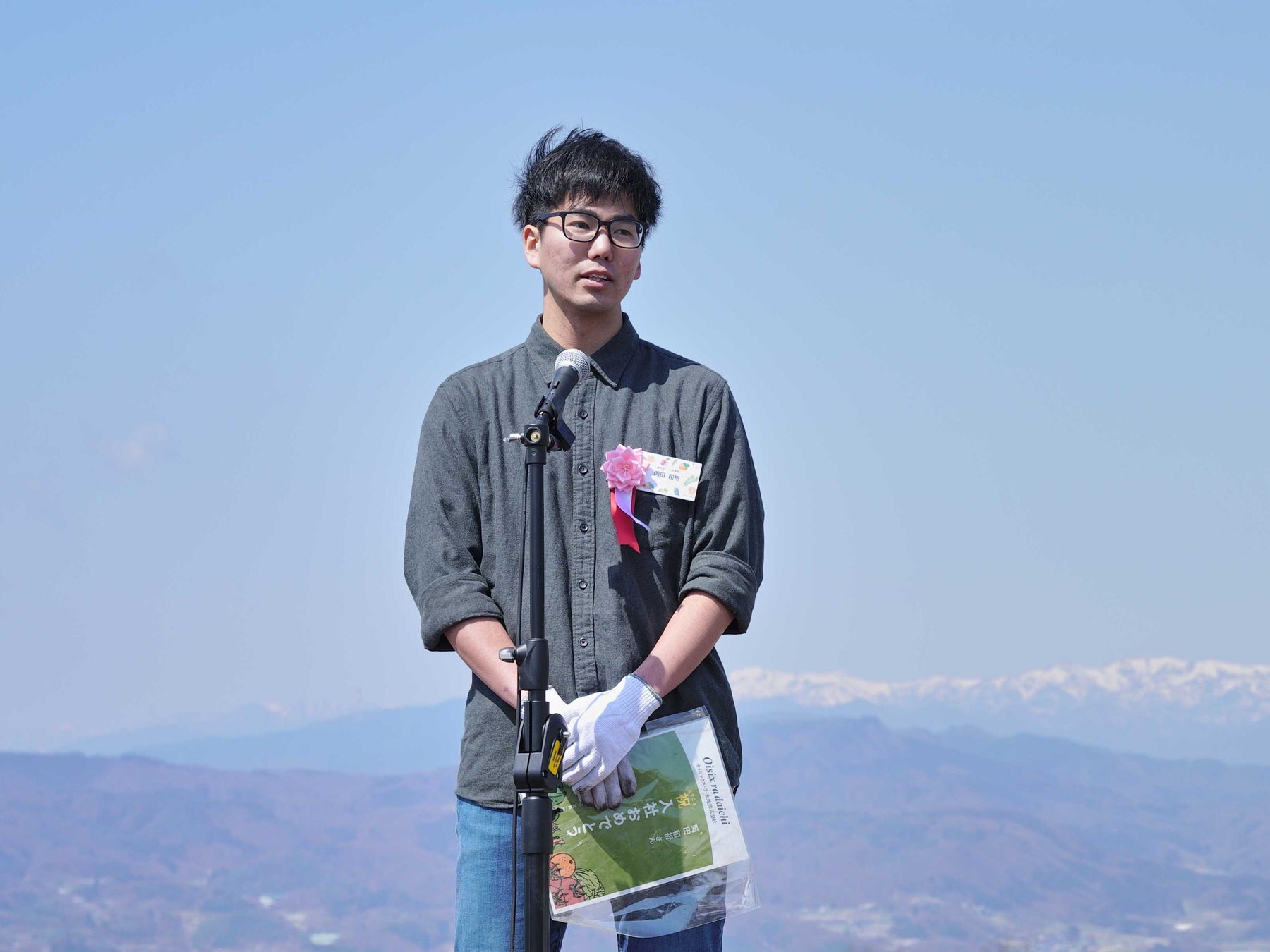 緊張した面持ちで新入社員代表の挨拶をしたのは、岡田和祈。日本の農業に貢献をしたいと思ったきっかけとなった高校生の時の先生からの投げかけ、今日からその夢をかなえることが出来る喜びなどを話してくれました。
