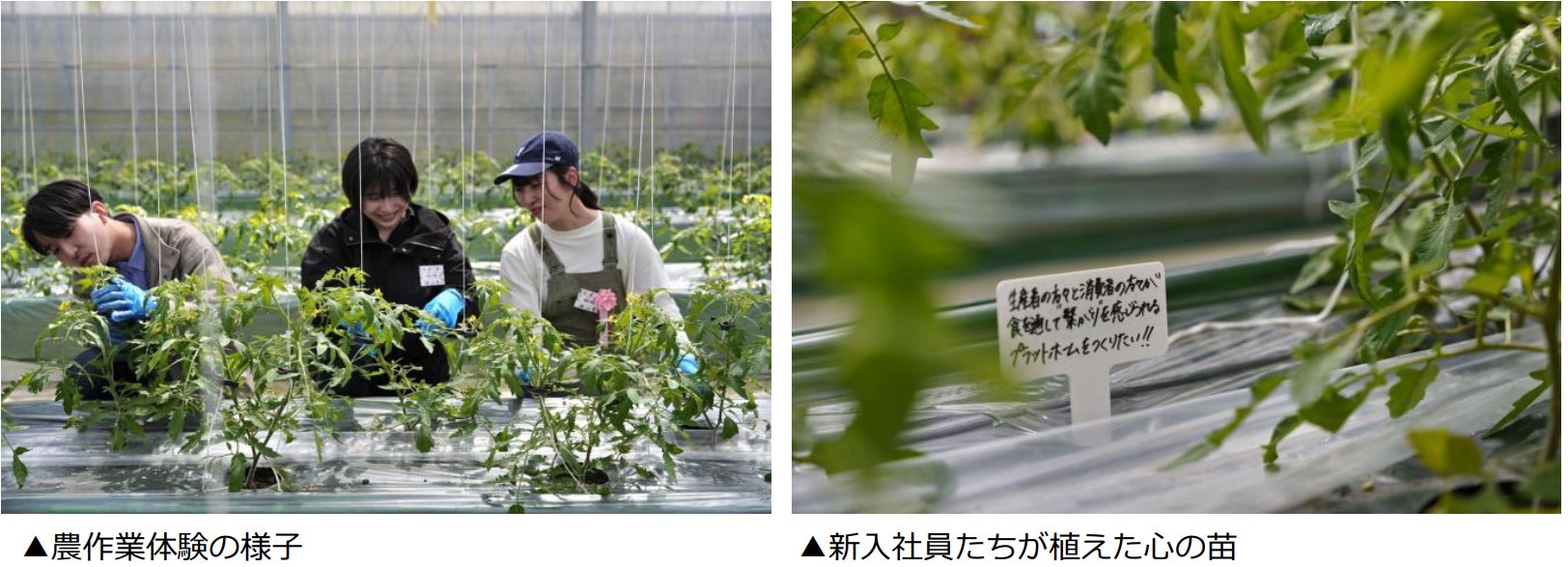 トマトのビニールハウスに移動し、生産者からトマトの栽培についての説明を受けた後は、成長を促すための農作業に挑戦しました。トマトの苗が倒れないように、誘引クリップを使ってしっかりと苗をロープに挟み留めしました。そして、社会人としての抱負、これから挑戦したいことを立札に記入した「心の苗」を、社会人としての第1日目を振り返ることができるように、自分たちが作業をしたトマトの苗の前に立てました。生産者から定期的に苗の成長の様子を聞かせてもらうことで、新入社員たちの成長とともに、トマトが真っ赤に実ることを見守りたいと思います。