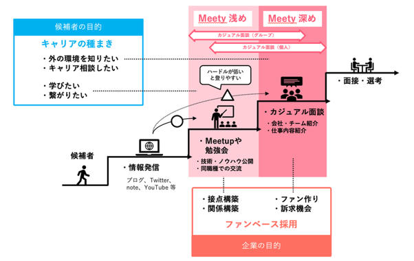 今回HIRAC FUNDが出資を行ったMeetyは、カジュアル面談プラットフォームを提供し、面接・選考に至る前に、企業の中で働く人との勉強会や交流、採用選考を目的としない参加ハードルの低い「カジュアル面談」の機会を創出します。これにより、潜在的候補者は「学びたい・繋がりたい」ニーズや「外の環境を知りたい・見たい」ニーズを満たしながら将来的なキャリアの種まきを行うことができ、また、企業側にとっても将来的な候補者となり得る層との接点作りやファンベース採用という中長期的な取組みに寄与することになるため、結果として、潜在的候補者に対してより良い候補者体験を提供できることになります。