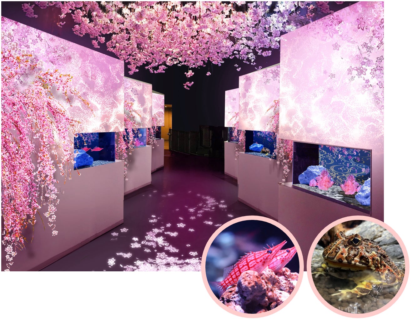 また、7つの小水槽には「クダゴンベ」や「ベルツノガエル」など、満開の桜を見あげているような姿の生きものを展示。
