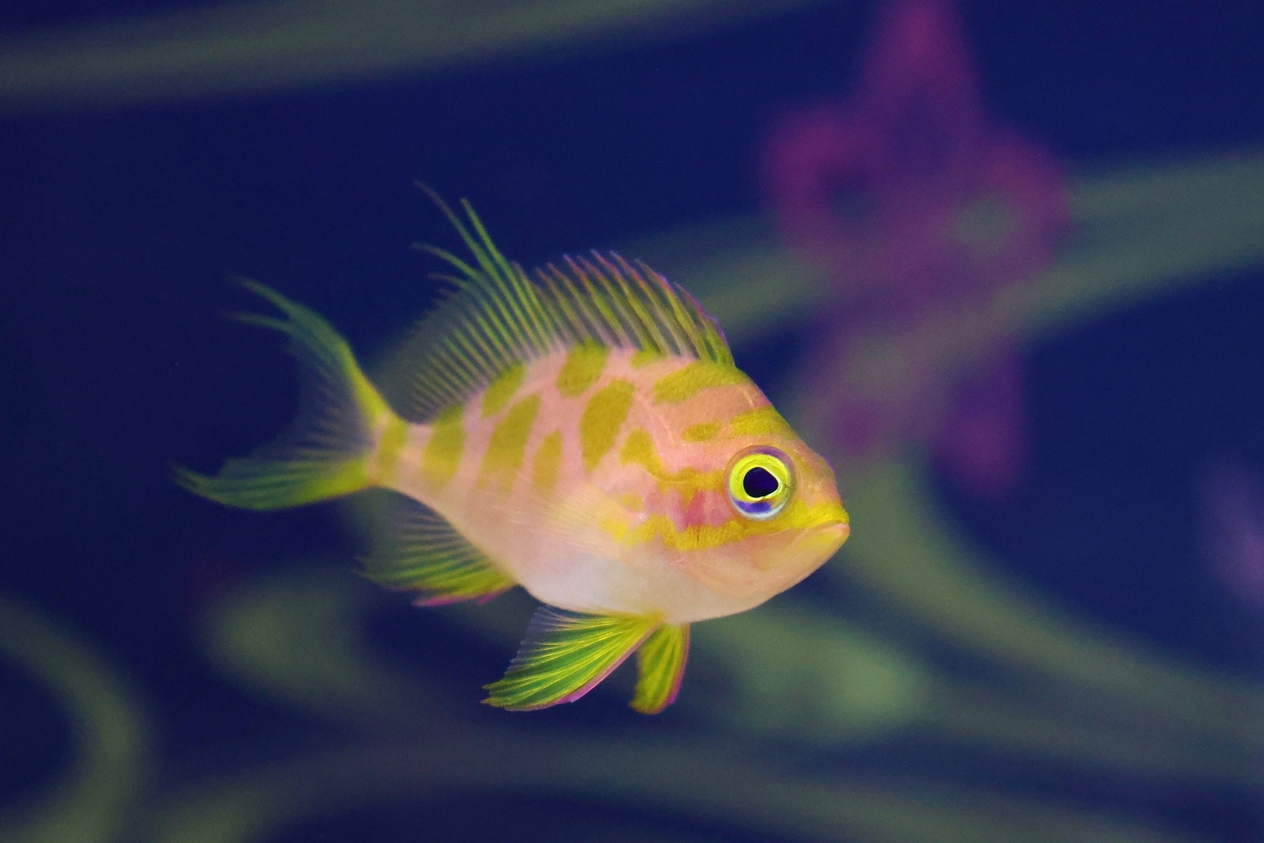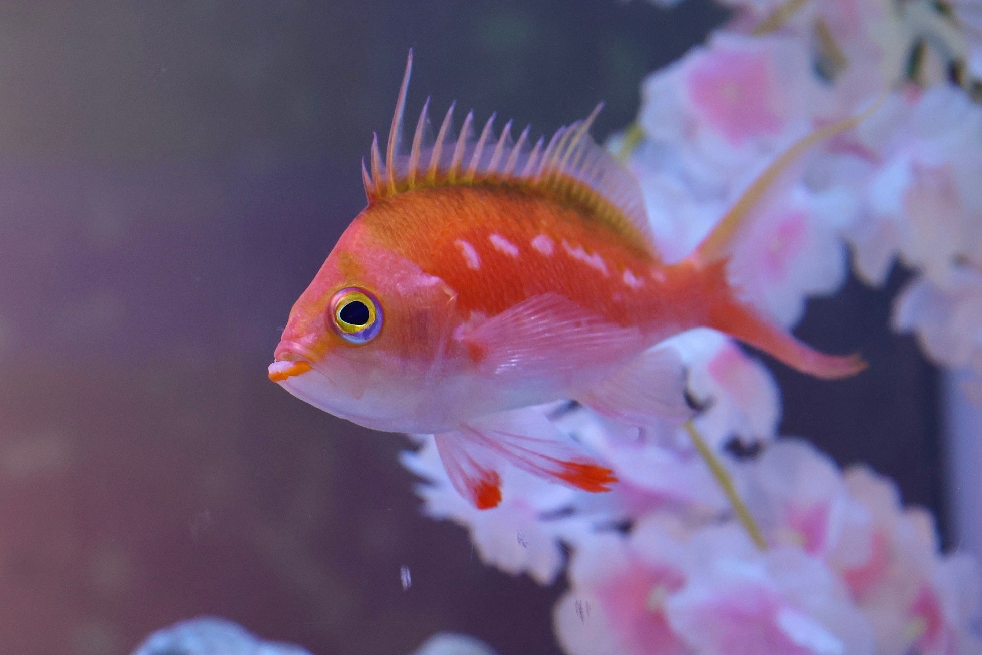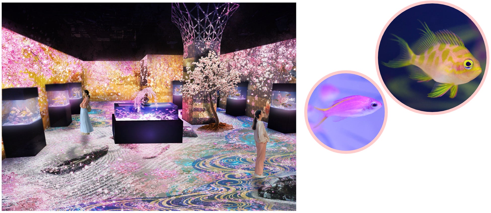 さらに、今年は柱下に約3mの桜の木(インテリアツリー)が登場!空間をより立体的に魅せ、季節感を色濃くご体感いただけるようになりました。水槽も桜や“和”を連想させる魚たちを展示。周囲を囲む11本の小水槽には「マダラハナダイ」や「アケボノハゼ」を。華やぐ桜アートを飾った“シンボリック水槽”は、花びらのように可憐な「パープルクイーン」を群れで展示します。多彩な魚と桜が織り成す、春爛漫の庭園。心安らぐひとときをお届けします。