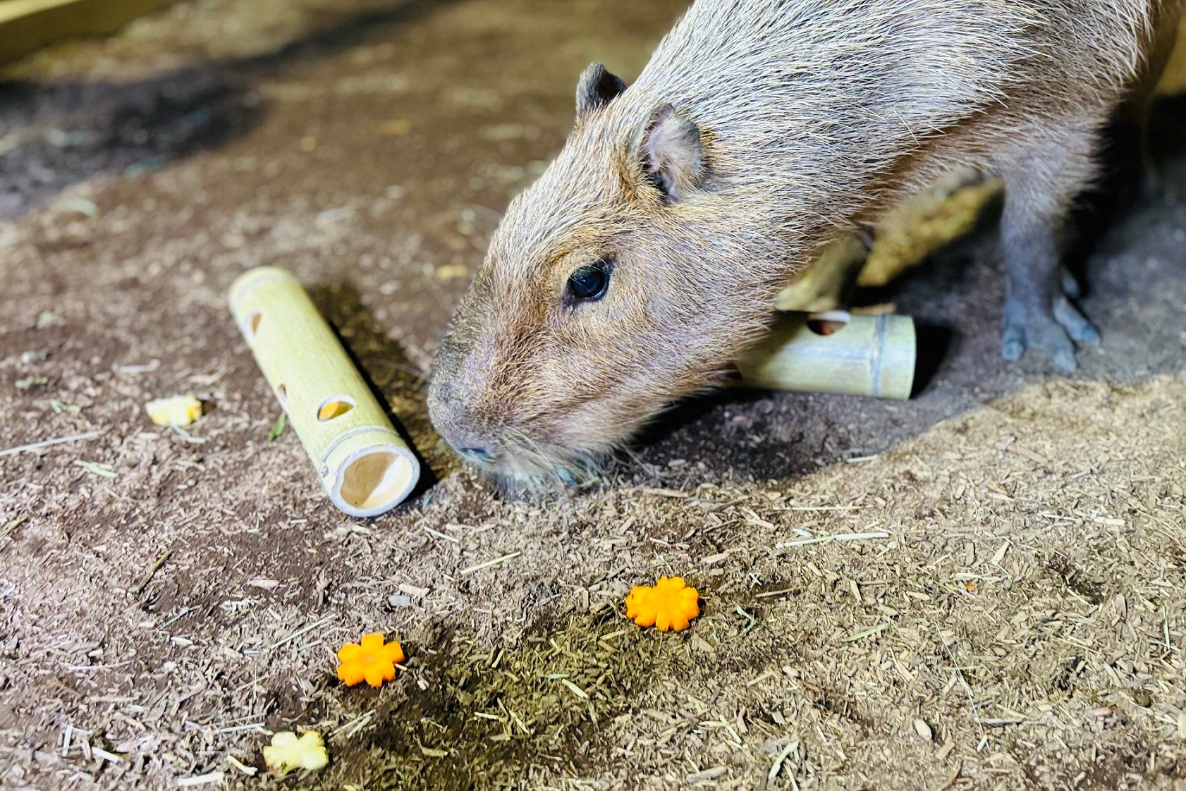 給餌やトレーニングに工夫を凝らし、生きものの生活をより豊かにする施策「エンリッチメント」。カピバラ展示室ではアクアジャングルに春を呼び込むように、花びら型のごはんを使った給餌・解説タイムを開催します。2頭が興味津々でフィーダー(給餌アイテム)を転がすと、中から出てくるのは花びら型にカットされた果物や野菜。