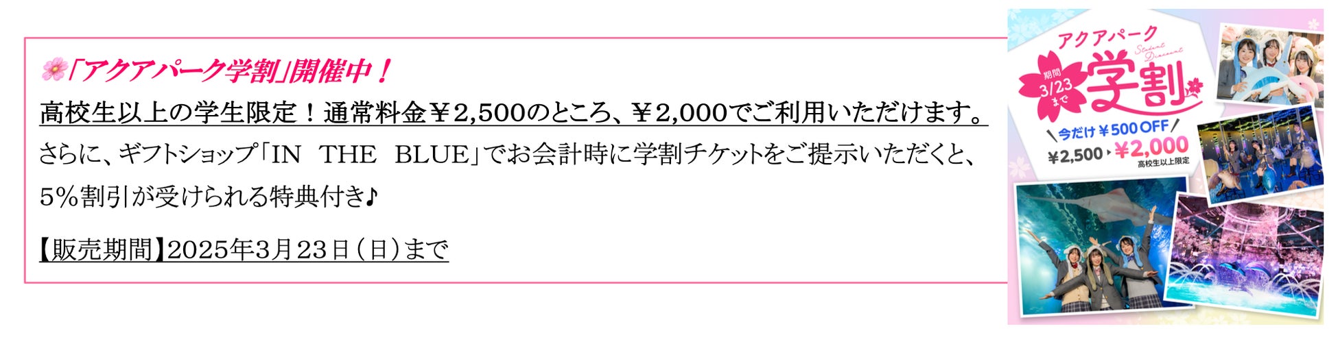 多彩なデジタルテクノロジー演出とイルカの躍動が魅せるナイトパフォーマンスです。360度満開の桜につつまれ、春色に染まった“海”では疾走感あふれる和楽器のメロディにのせて、イルカたちがダイナミックなパフォーマンスを披露!ジャンプや優雅な水中ダンスを通じて、桜の花が持つさまざまな“表情”を描きます。なお、美しい世界観に浸っていただけるようMCを入れず、演出のみでストーリーを展開。アクアパークが誇る、唯一無二の“夜桜鑑賞”をお届けします。