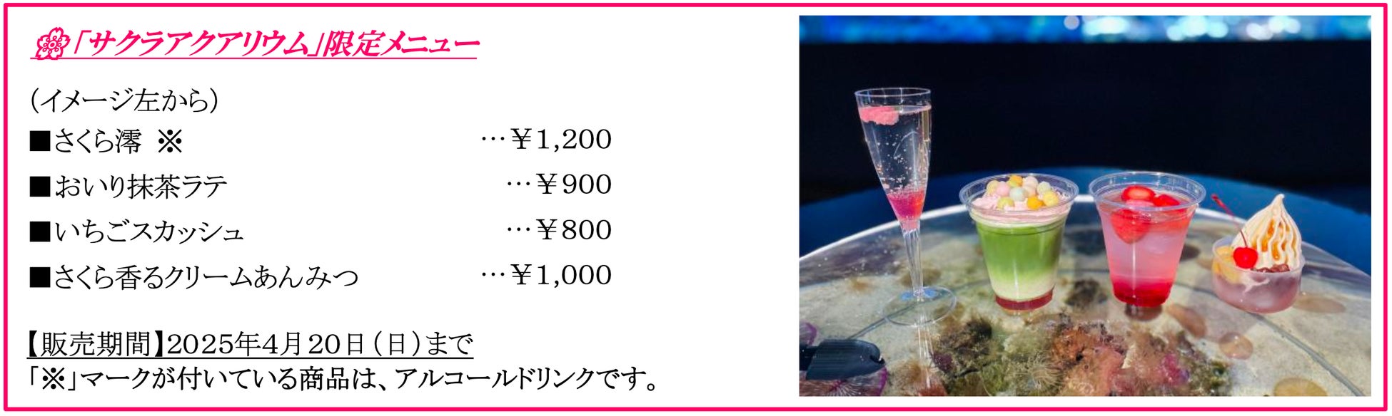 発光サンゴの水槽が並ぶカフェバーも桜の装いに変わり、一層華やかな空間に。さらに、バーカウンター近くに並ぶ2つの円柱水槽には赤い番傘が添えられ、和の趣を引き立てます。こちらでは抹茶が香るドリンクや、春が旬の苺を使ったスカッシュ、桜風味のあんみつなど4種類の「サクラ