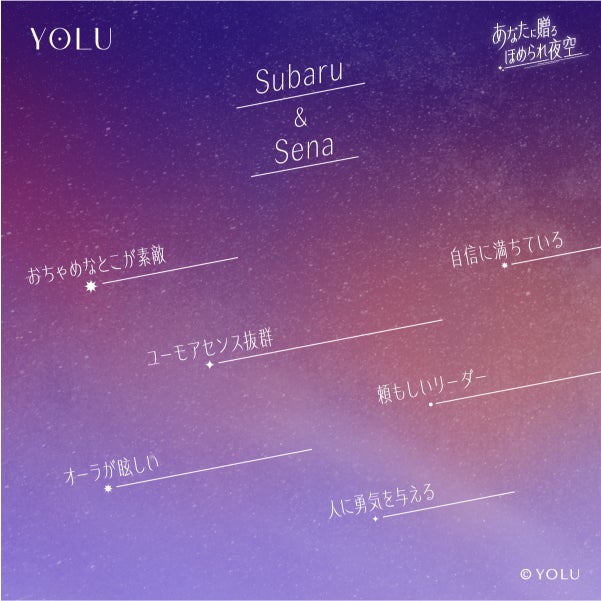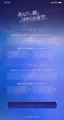 株式会社I-ne (本社:大阪市中央区) が展開する、ナイトケアビューティーブランド「YOLU(ヨル)」から、ふたりの名前と誕生日を入力するとスマホ画面いっぱいにふたりのバースデーカラーの夜空が広がり、200種類以上のオリジナルの”ほめられメッセージ”からふたりに向けたメッセージが自動生成される、ふたり版「ほめられ夜空」を12月19日(木)にリリースします。
