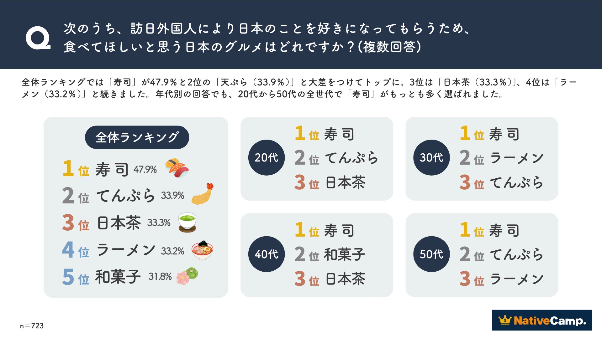 次に、訪日外国人におすすめしたい日本のグルメについて、全体ランキングでは「寿司」が47.9%と2位の「天ぷら(33.9%)」と大差をつけてトップに。3位は「日本茶(33.3%)」、4位は「ラーメン(33.2%)」と続きました。年代別の回答でも、20代から50代の全世代で「寿司」がもっとも多く選ばれました。