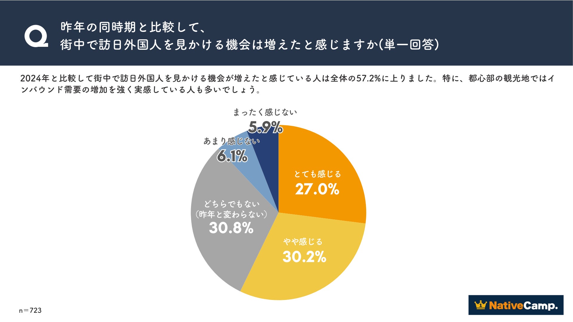 まず、2024年と比較して街中で訪日外国人を見かける機会が増えたと感じている人は全体の57.2%に上りました。特に、都心部や観光地ではインバウンド需要の増加を強く実感している人も多いでしょう。
