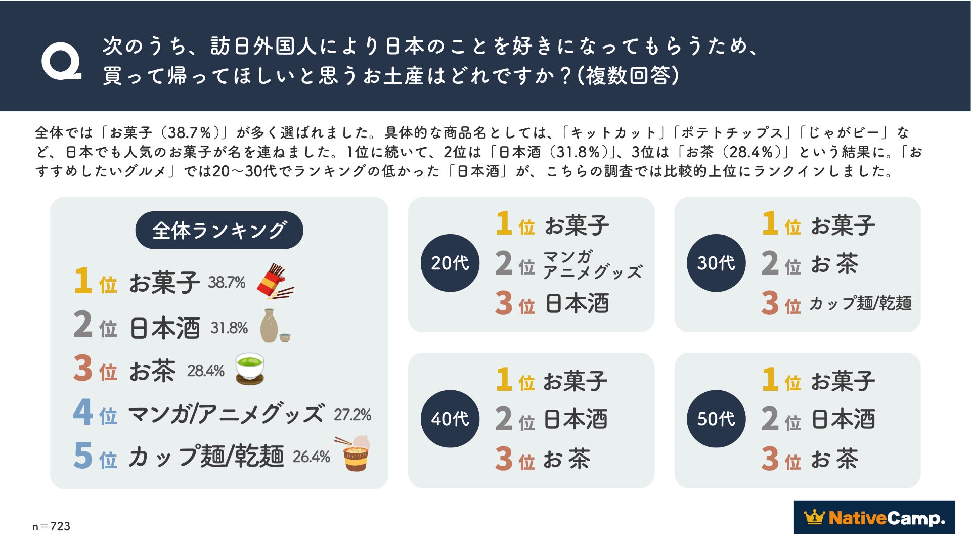 1位に続いて、2位は「日本酒(31.8%)」、3位は「お茶(28.4%)」という結果に。「おすすめしたいグルメ」では20~30代でランキングの低かった「日本酒」が、「買ってほしいお土産」としては20代は3位(26.7%)、30代は5位(24.7%)と比較的上位にランクインしました。