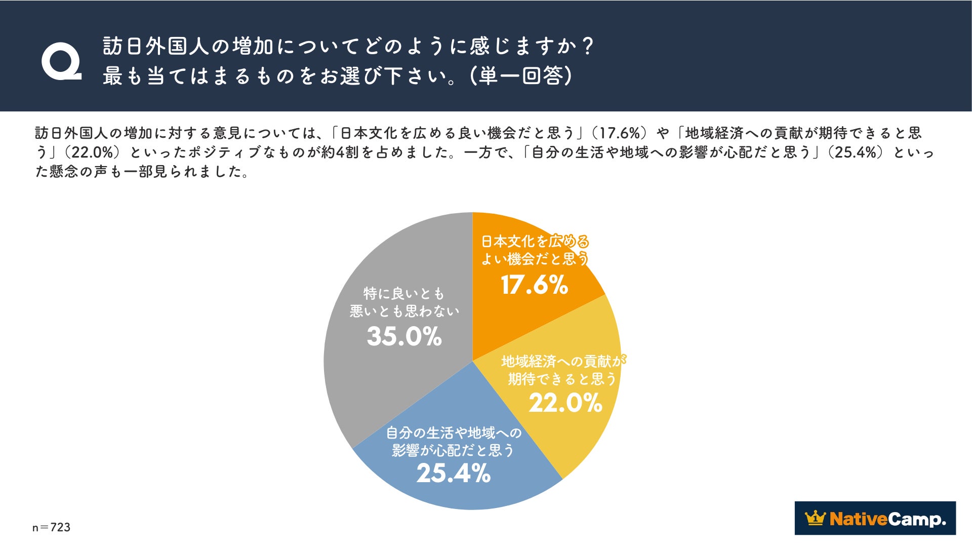 続いて、訪日外国人の増加に対する意見については、「日本文化を広める良い機会だと思う」(17.6%)や「地域経済への貢献が期待できると思う」(22.0%)といったポジティブな回答が約4割を占めました。一方で、「自分の生活や地域への影響が心配だと思う」(25.4%)といった懸念の声も一部見られました。