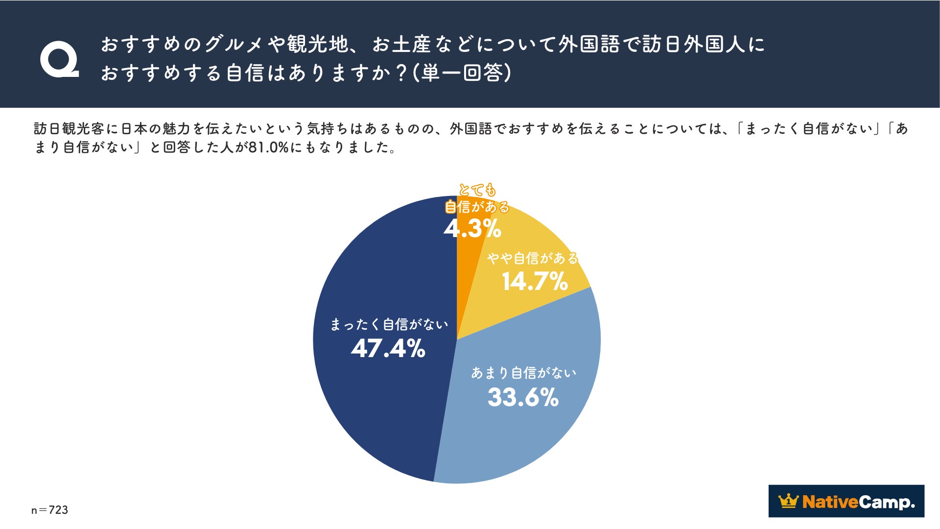 続いて、訪日観光客に日本の魅力を伝えたいという気持ちはあるものの、外国語でおすすめを伝えることについては、「まったく自信がない」「あまり自信がない」と回答した人が81.0%にもなりました。