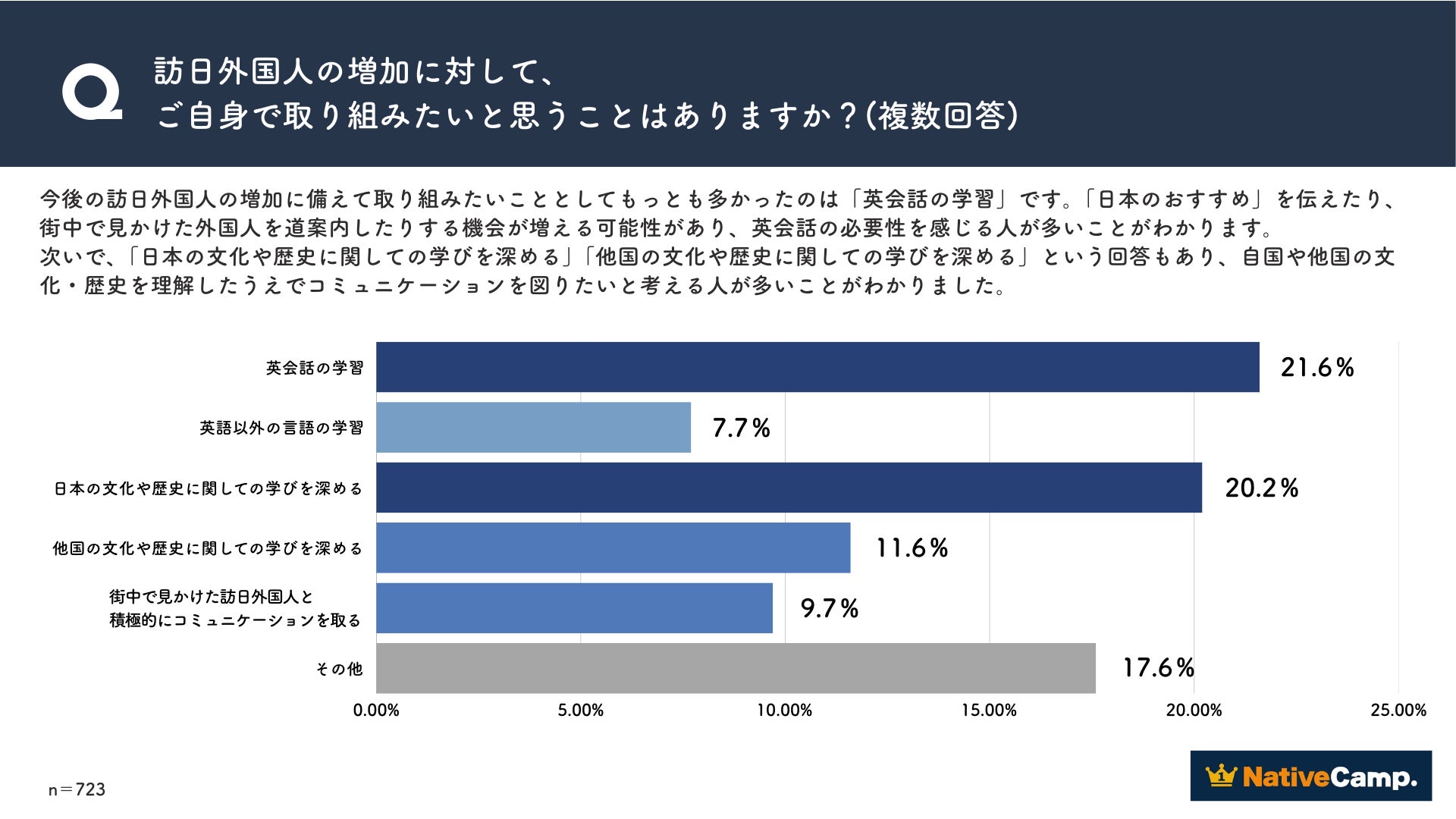 そのうえで、今後の訪日外国人の増加に備えて取り組みたいこととしてもっとも多かったのは「英会話の学習」です。「日本のおすすめ」を伝えたり、街中で見かけた外国人を道案内したりする機会が増える可能性があり、英会話の必要性を感じる人が多いことがわかります。次いで、「日本の文化や歴史に関しての学びを深める」「他国の文化や歴史に関しての学びを深める」という回答もあり、自国や他国の文化・歴史を理解したうえでコミュニケーションを図りたいと考える人が多いことがわかりました。