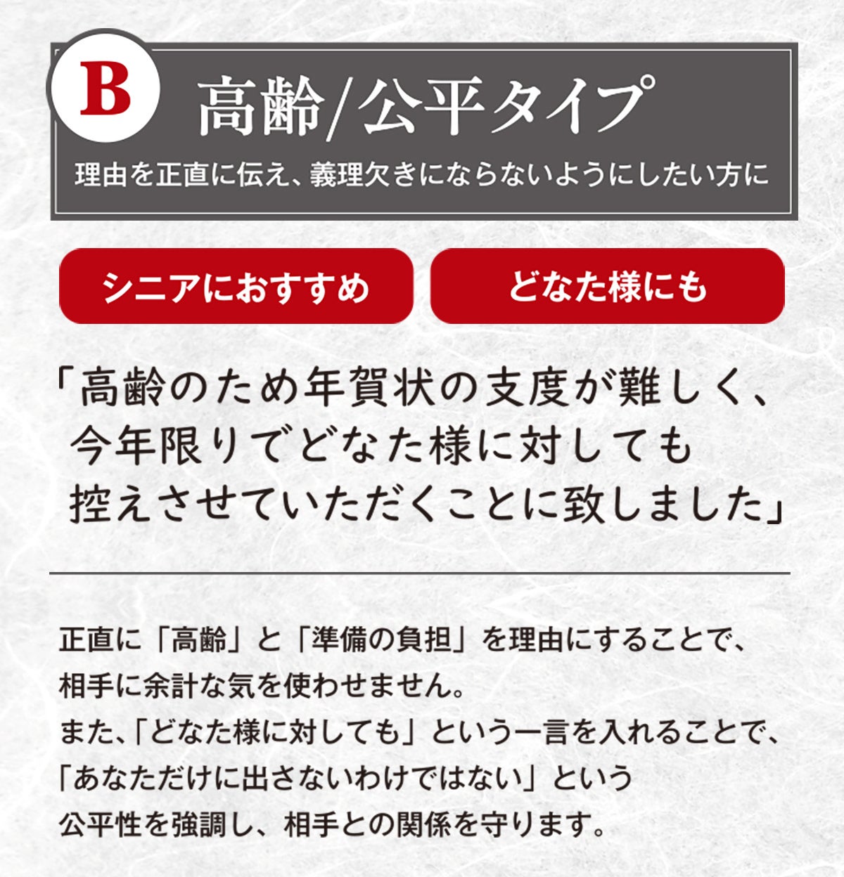 Bタイプ:【高齢・公平】 理由を正直に伝え、義理欠きにならないようにしたい方に