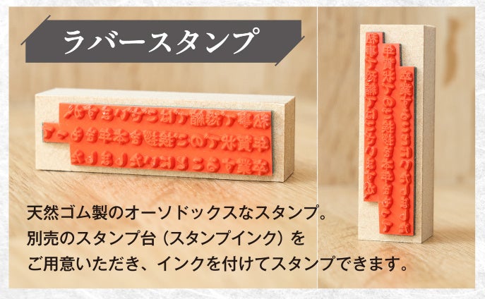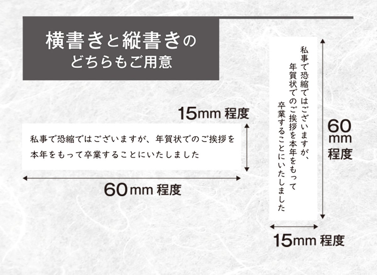 年賀状の形状にあわせて、横書き・縦書きの2タイプをご用意。サイズは60×15ミリとなります。