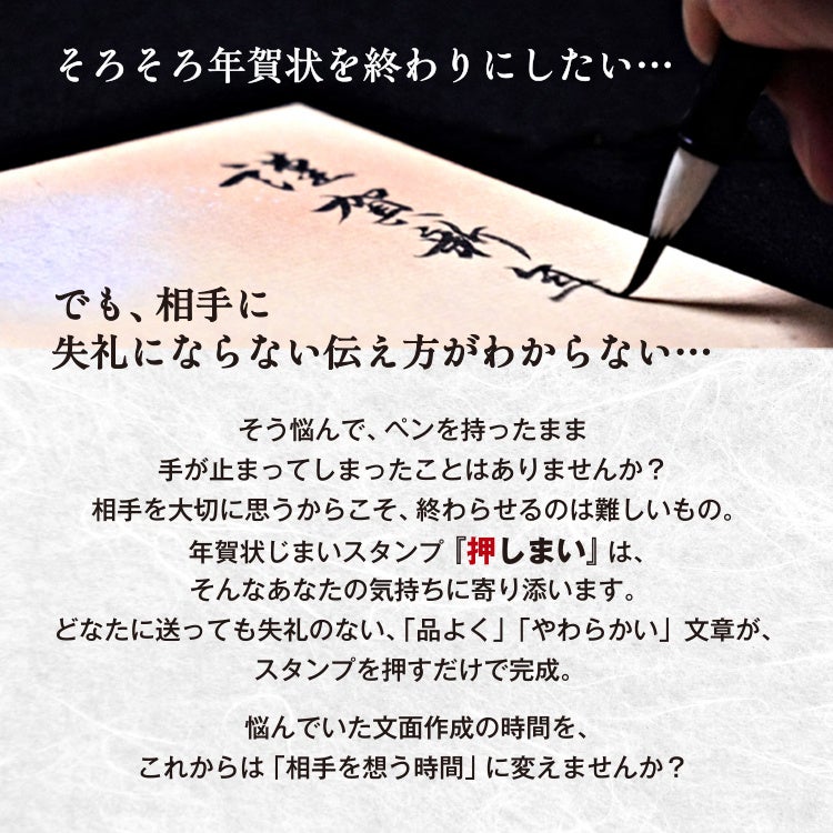 伝えたいけど伝えづらい“年賀状じまい”。ポン!と押すだけで、品よく丁寧に年賀状じまいを伝えるスタンプ『押しまい』発売開始