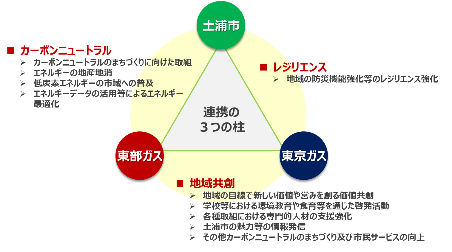 土浦市(市長:安藤 真理子)、東部ガス株式会社(社長:穴水 一行、以下「東部ガス」)、東京ガス株式会社(社長:内田 高史、以下「東京ガス」)は、本日、「カーボンニュートラルのまちづくりに向けた包括連携協定」(以下「本協定」)を締結しました。