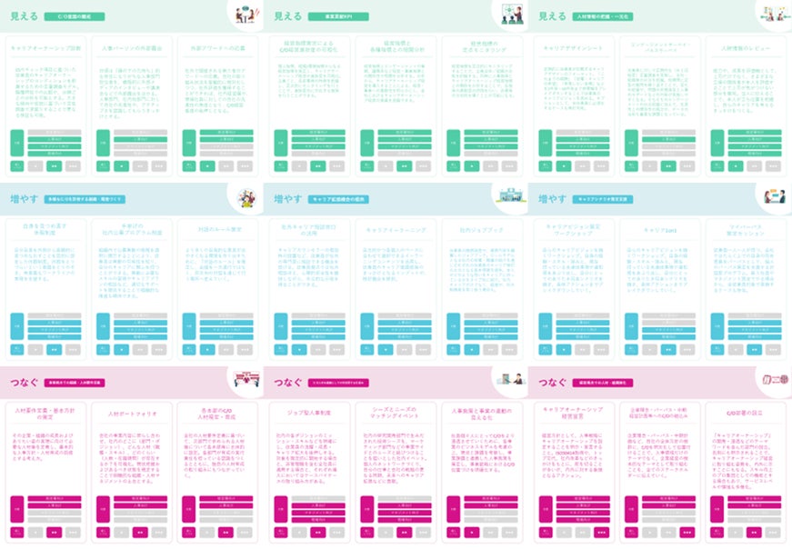 「はたらく未来白書」で紹介しているキャリアオーナーシップ経営を実践・推進するための3つの視点「見える・増やす・つなぐ」のフレームに沿って、107のアクションが格納されています。