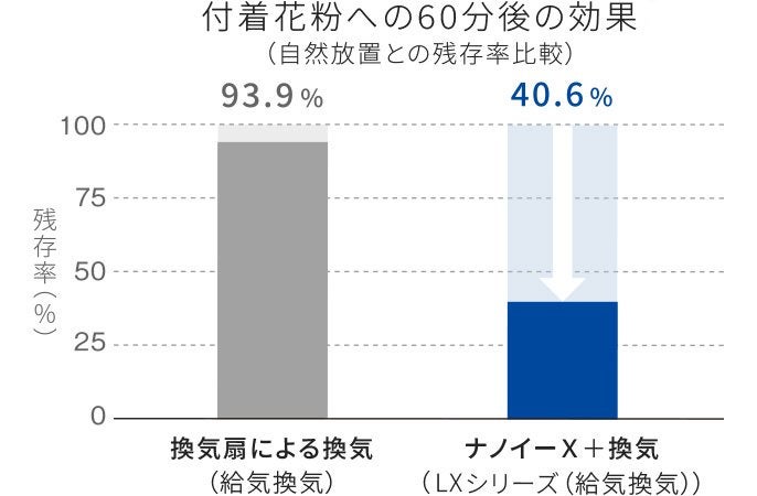 一般的な「換気扇による給気換気」と、エオリアLXシリーズによる「ナノイーX+換気」を比較すると、花粉の残存率が40%まで低減!※