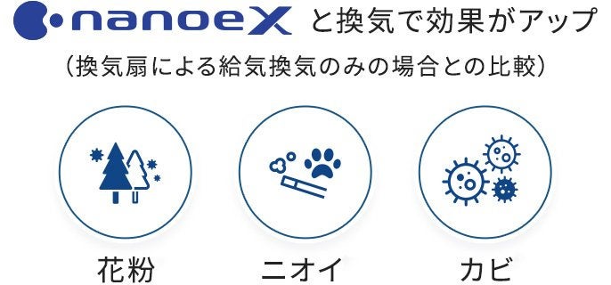 また、冷暖房や換気をしながら同時にナノイーXを放出するため、花粉はもちろん、ニオイやカビ菌などにも抑制効果を発揮します。