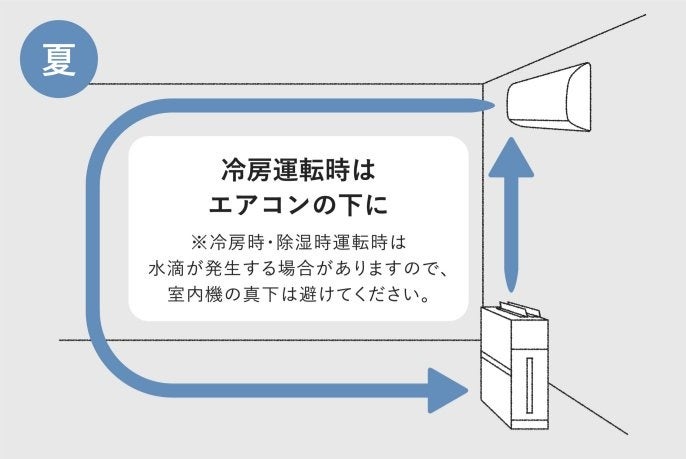 反対に夏はエアコンの風向きを上にして、天井をつたって下に落ちる大きな気流を作るため、エアコンの下に空気清浄機を配置しましょう。この時、気流が家具などで妨げられないように注意してください。